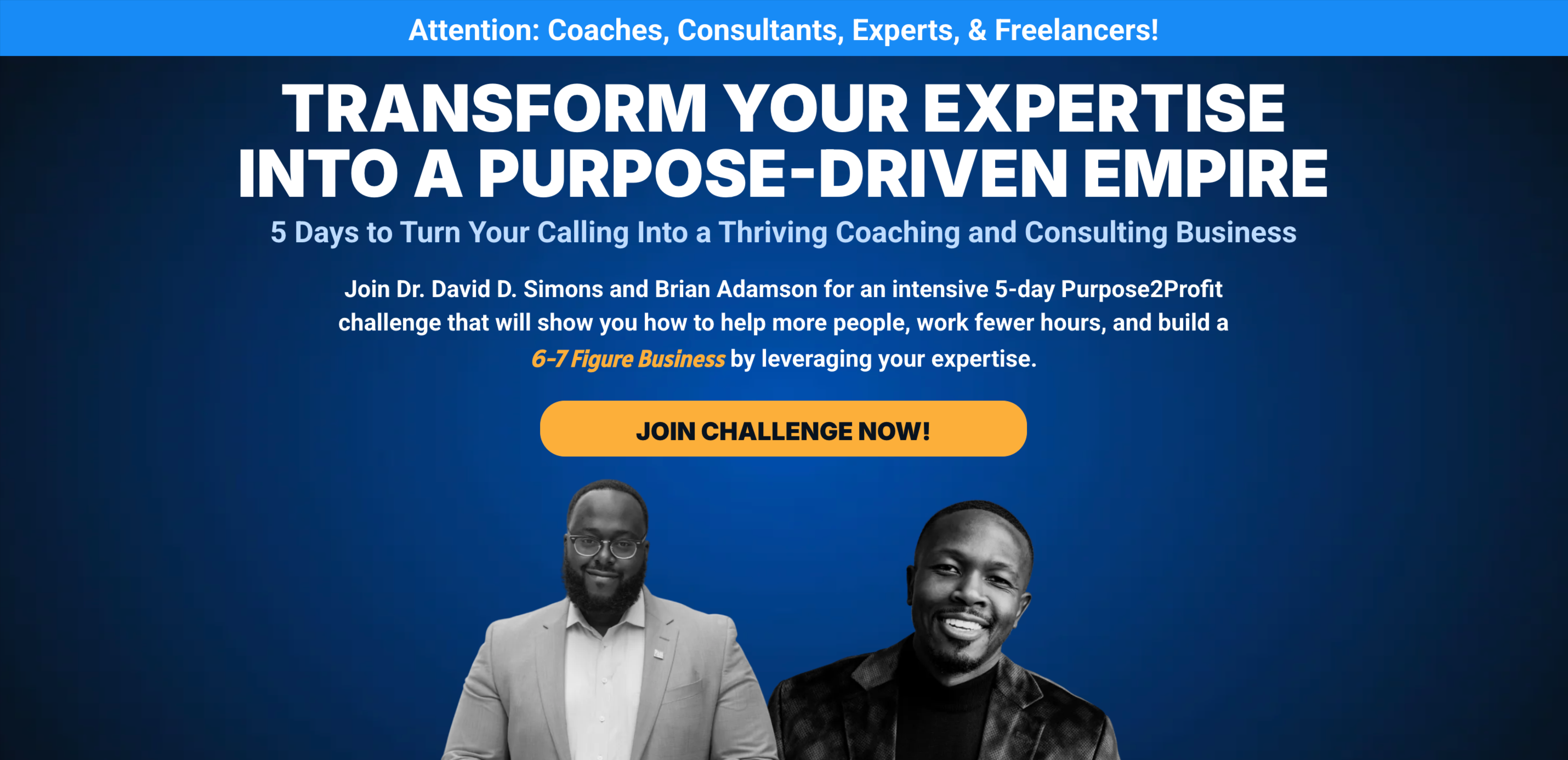 Join the Purpose to Profits Challenge —a-day live experience where coaches and consultants learn how to repackage their expertise into a premium, scalable offer.